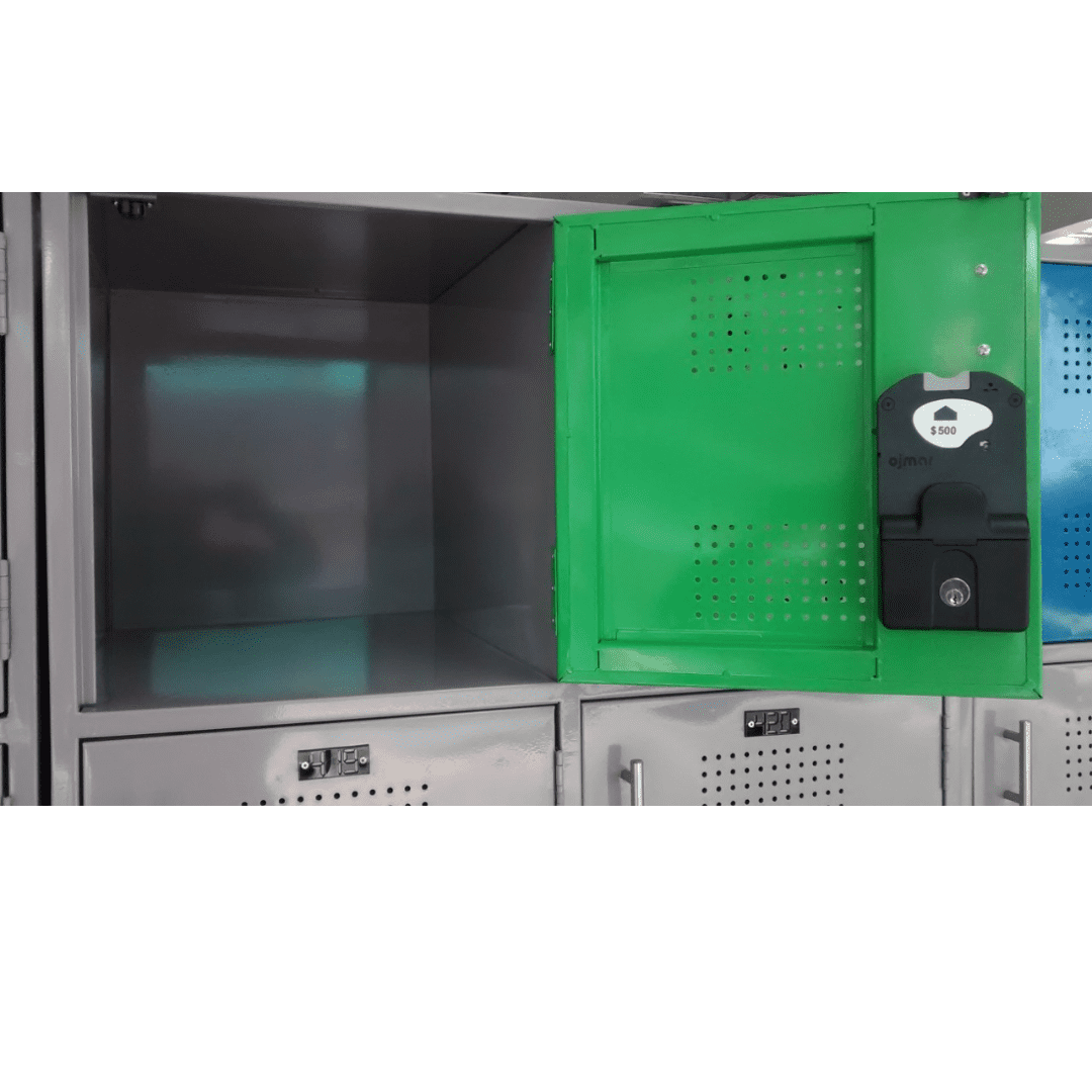 Locker metálico, medidas según requerimiento, casillas con o sin división para calzado, puertas sobre bisagra común de 3¨, reforzadas perimetralmente, manija tubular, perforaciones de ventilación, cerradura monedero importada, codificada para monedas de $ 200, $ 500 y/o $ 1,000, con 2 llaves, cierre magnético, base con tacón plástico de 4 cm de alto, fabricado en su totalidad en lámina CR calibre 20 o 22, terminado en pintura electrostática en polvo.